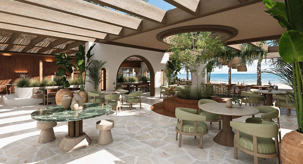 Große Fensterflächen und offene Übergänge zwischen Innen- und Außenbereichen schaffen ein Gefühl von Weite. Gleichzeitig sorgen bepflanzte Höfe und schattige Terrassen für Rückzugsmöglichkeiten. Ziel ist ein Resort, das sich harmonisch in seine Umgebung einfügt und dennoch klar als modernes Luxushotel erkennbar bleibt.
